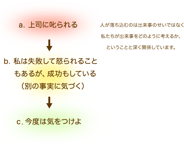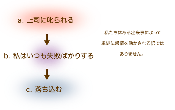 「私はいつも失敗ばかりする」から「私は失敗して怒られることもあるが成功もしている」にbの考えを切り替えることが出来たらどうなるでしょう。結果cが変わることに納得頂けるでしょうか。